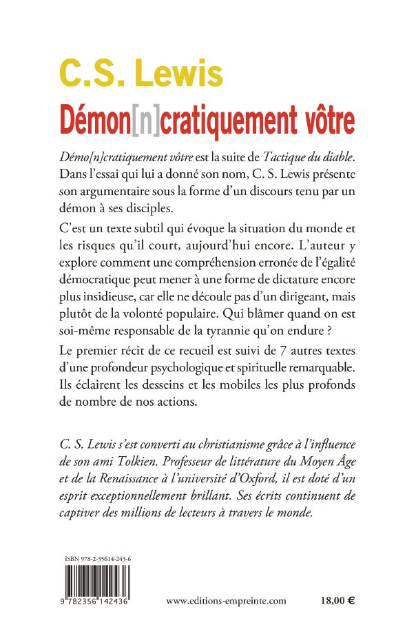 Achevé peu avant la mort de l’auteur en 1963, cet ouvrage vient à la suite de « Tactique du diable ». Il reprend la méthode utilisée dans cette première oeuvre, mais il s’attache ici à décrire les écueils de la vie chrétienne sous la forme du discours d’un démon à ses élèves sur la manière efficace de pervertir les hommes. Texte subtil qui évoque la situation du monde et les risques qu’il court. Lewis y dénonce les dérives d’une notion trop floue de la démocratie. Les hommes sont-ils réellement égaux ? Certes, en droit, ils le sont, mais dans les faits cela semble beaucoup moins évident. Pour cause, leur situation initiale – et c’est ce que dénonce ici Lewis – mais également parce qu’ils ne font aucun effort pour cela. Une conception erronée de l’égalité démocratique conduit à son contraire, une tyrannie d’autant plus dangereuse qu’elle n’est plus le fait d’un tyran, mais du peuple lui-même. Quel ennemi désigner lorsque l’on est soi-même responsable de la tyrannie que l’on subit ?