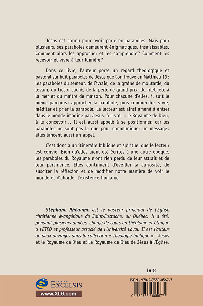 Dans ce livre, l’auteur porte un regard théologique et pastoral sur huit paraboles de Jésus que l’on trouve en Matthieu 13 : les paraboles du semeur, de l’ivraie, de la graine de moutarde, du levain, du trésor caché, de la perle de grand prix, du filet jeté à la mer et du maître de maison. Pour chacune d’elles, il suit le même parcours : approcher la parabole, puis comprendre, vivre, méditer et prier la parabole. Le lecteur est ainsi amené à entrer dans le monde imaginé par Jésus, à « voir » le Royaume de Dieu, à le concevoir… Il est aussi appelé à se positionner, car les paraboles ne sont pas là que pour communiquer un message : elles lancent aussi un appel.