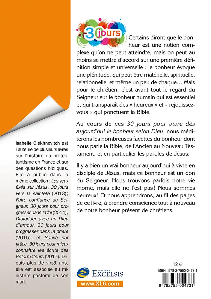 Isabelle Olekhnovitch est l’auteure de plusieurs livres sur l’histoire du protestantisme en France et sur des questions bibliques. Elle a publié dans la même collection : Les yeux fixés sur Jésus. 30 jours vers la sainteté (2013) ; Faire confiance au Seigneur. 30 jours pour pro gresser dans la foi (2014) ; Dialoguer avec un Dieu d’amour. 30 jours pour progresser dans la prière (2015) ; et Sauvé par grâce. 30 jours pour mieux connaître les écrits des Réformateurs (2017). Depuis plus de vingt ans, elle est associée au ministère pastoral de son mari.